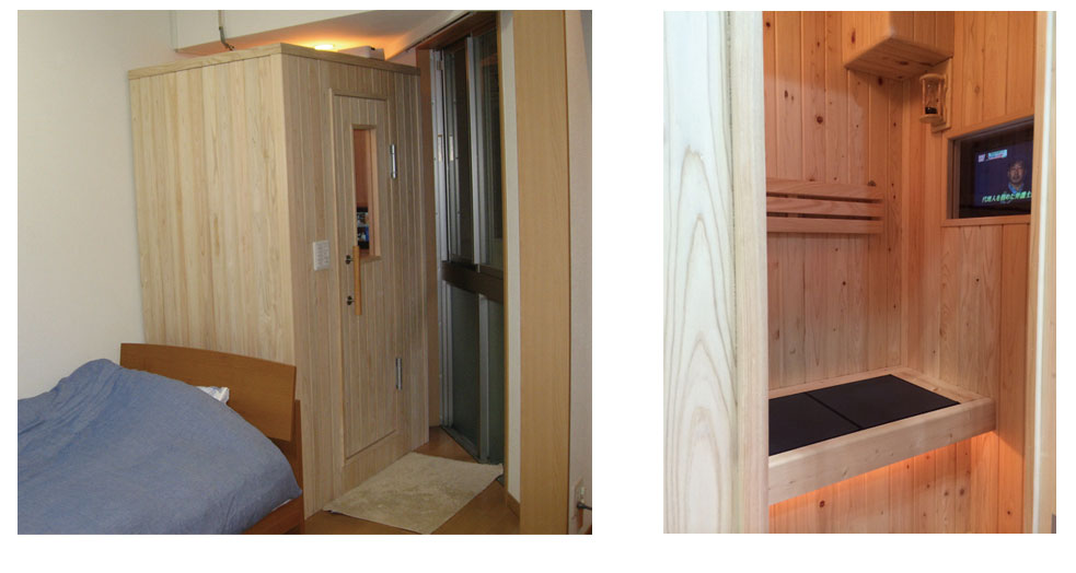 また、超音波加湿器により室内の湿度を息苦しさの少ない55%に保ちますので、体にかける負担が少なく、心臓の弱い方やお子さまにも手軽にご利用いただけます。(毎日、5~30分で無理のない発汗作用により、身体を正常な弱アルカリ性体質に戻していきます。)